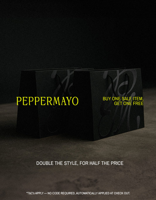 T&CS: Buy one sale item and get one free. Available only on sale items. The item of the lowest cost will be discounted to free. This offer cannot be used in conjunction with any other promotion or discount. Please note red-penned Sale items are non-returnable. The offer may be revoked at any time at Peppermayo's ultimate discretion.