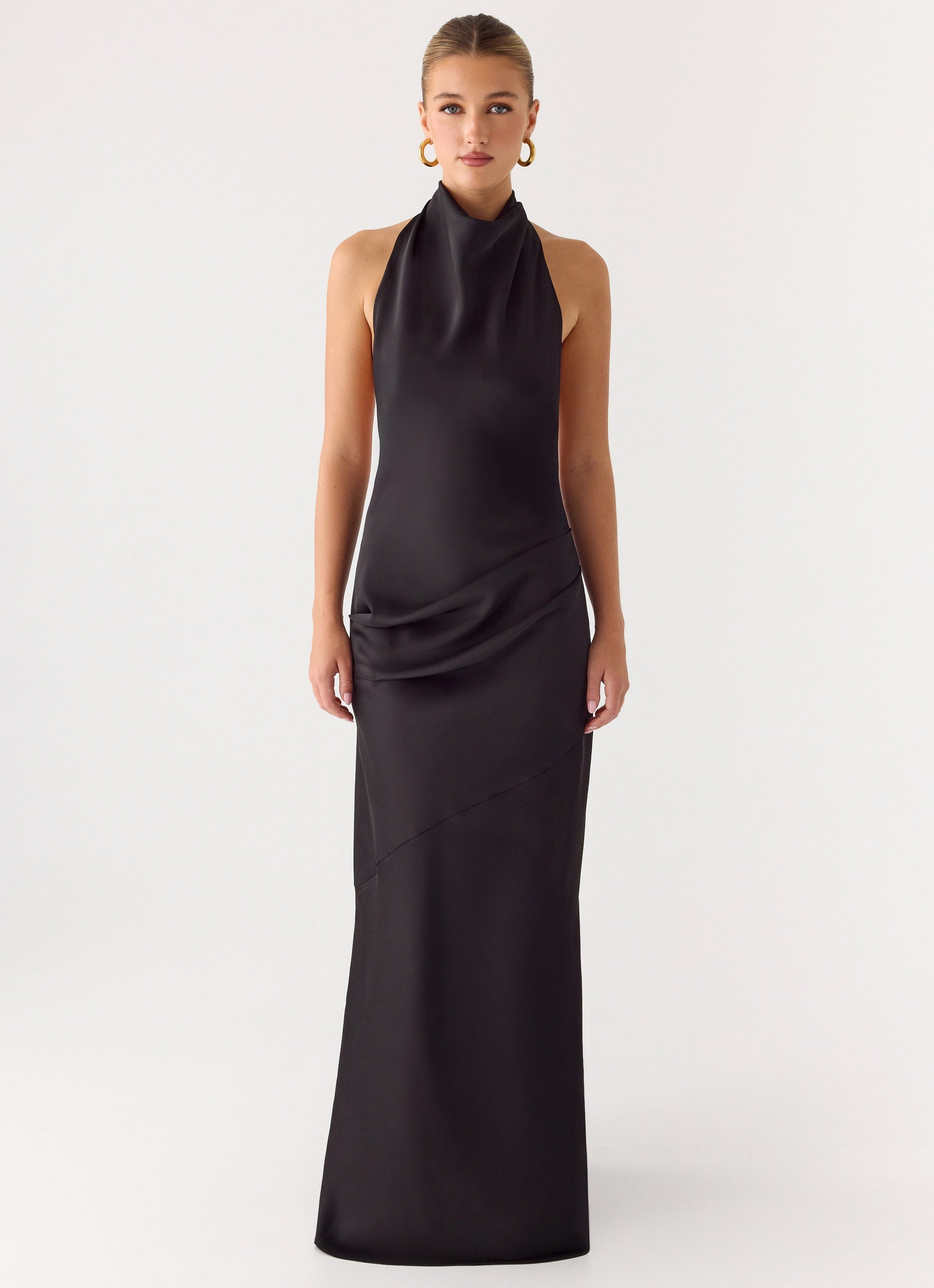 The Back To Life Halter Maxi Dress brings an elegant, fluid silhouette with a soft satin shine. Designed with a draped halter cowl neckline and a low open back, it’s the perfect piece for evening events and special occasions. The fully lined finish and invisible side zip create a smooth, refined fit.