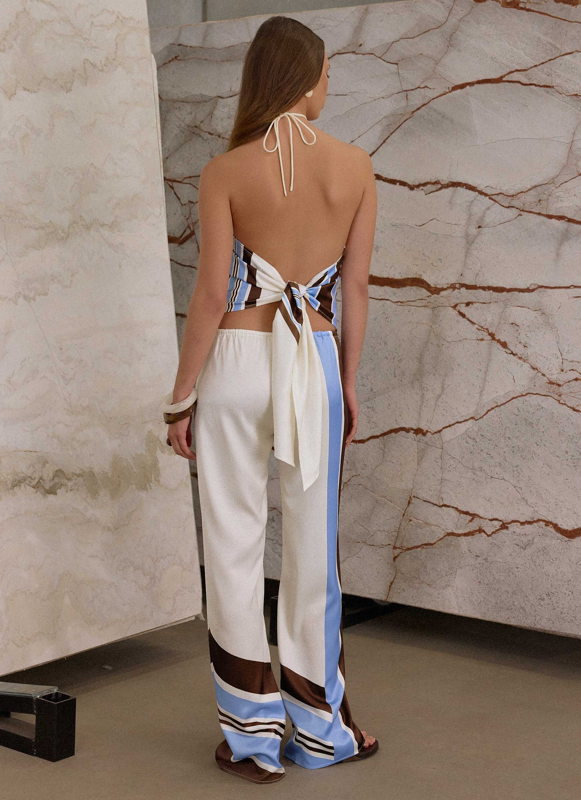 The Julissa Halter Top features beaded straps and an open back for a touch of playful elegance. Designed with an exclusive print, this piece offers a flattering silhouette, with each garment boasting a one-of-a-kind print placement for a personalized style statement.